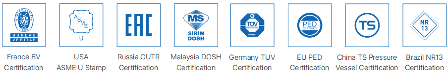 We are continuously strengthening and improving our global supply chain system. To comply with global quality standards, INOCO factory has passed certifications such as Bureau Veritas (France) factory certification, TUV (Germany) factory certification, ASME U Stamp (USA), EU PED, Russia CUTR, and China TS Pressure Vessel.