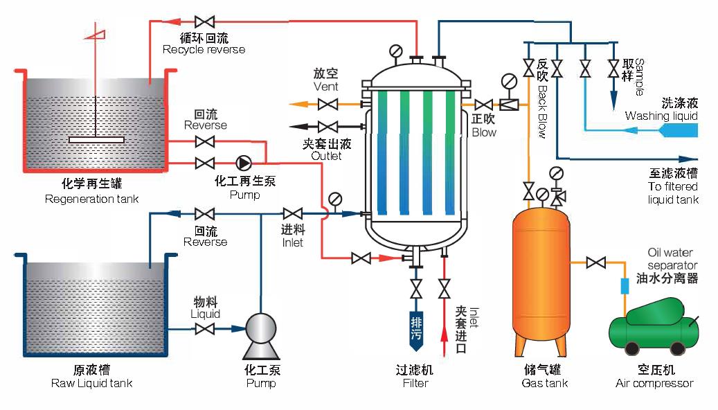 When the pressure drop to the set value, inlet and outlet valve turn off, compressed air flow into the filter and dry the filter cake, in the backwashing processing, the particles will be removed, and the filter element could be regenerate.